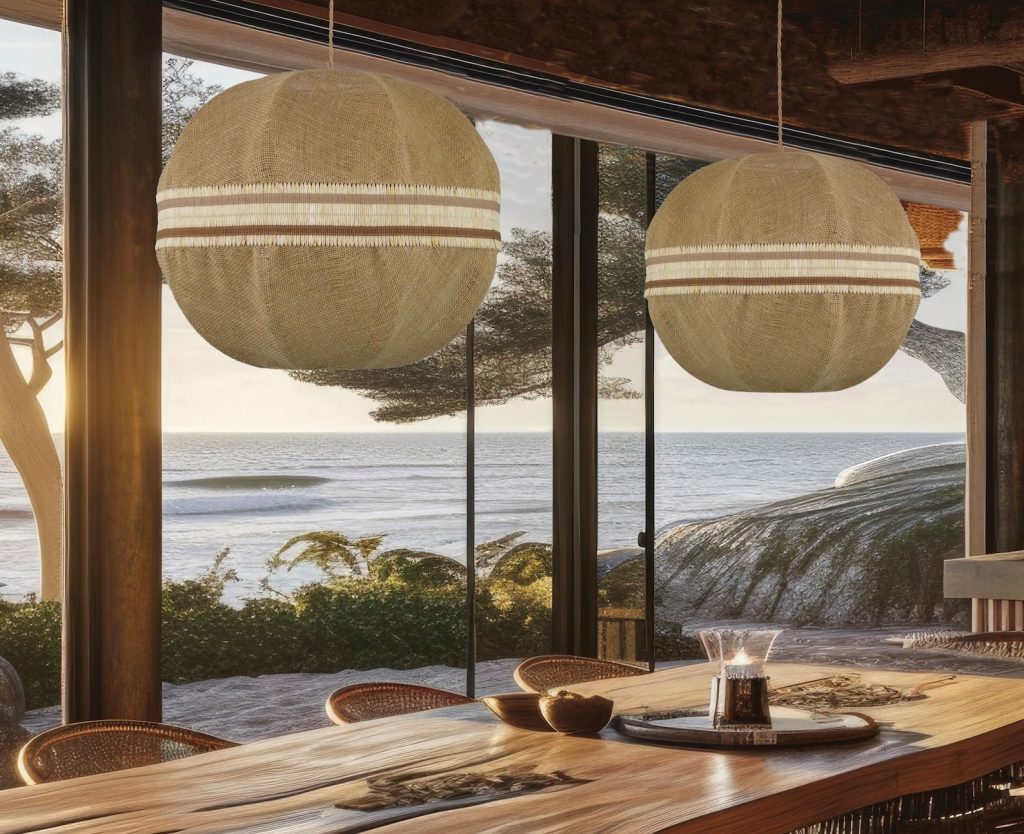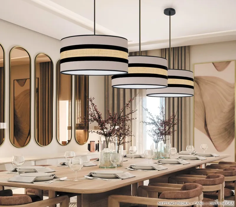 Lámparas tipo pantalla realizadas en materiales naturales como lino, caña, fibra de coco, aldodón, ideales para combinar con acabados tierra, arcilla y arena también de tendencia para 2026.