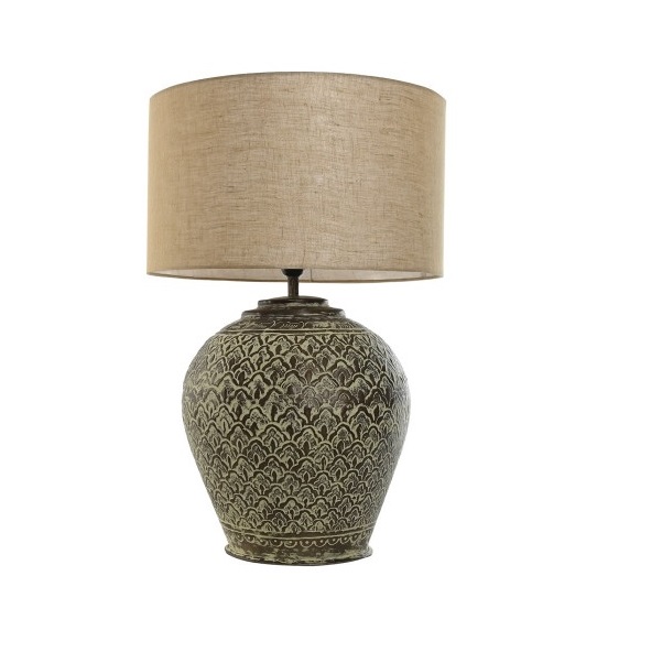 Sobremesa en aluminio color de cobre patinado con pantalla en lino jaspeado.