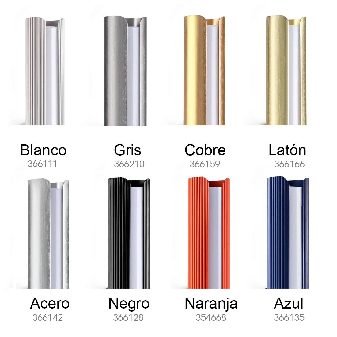 Blanco, Gris, Latón, Cobre, Naranja, Azul, Acero, Negro