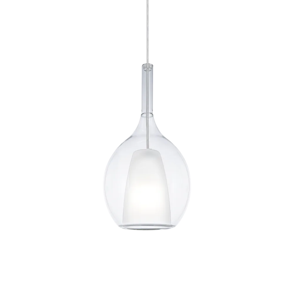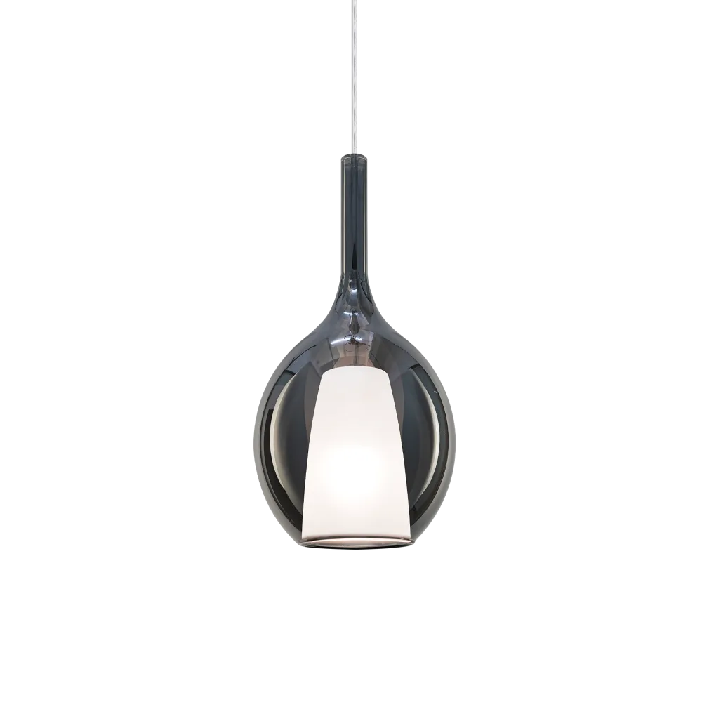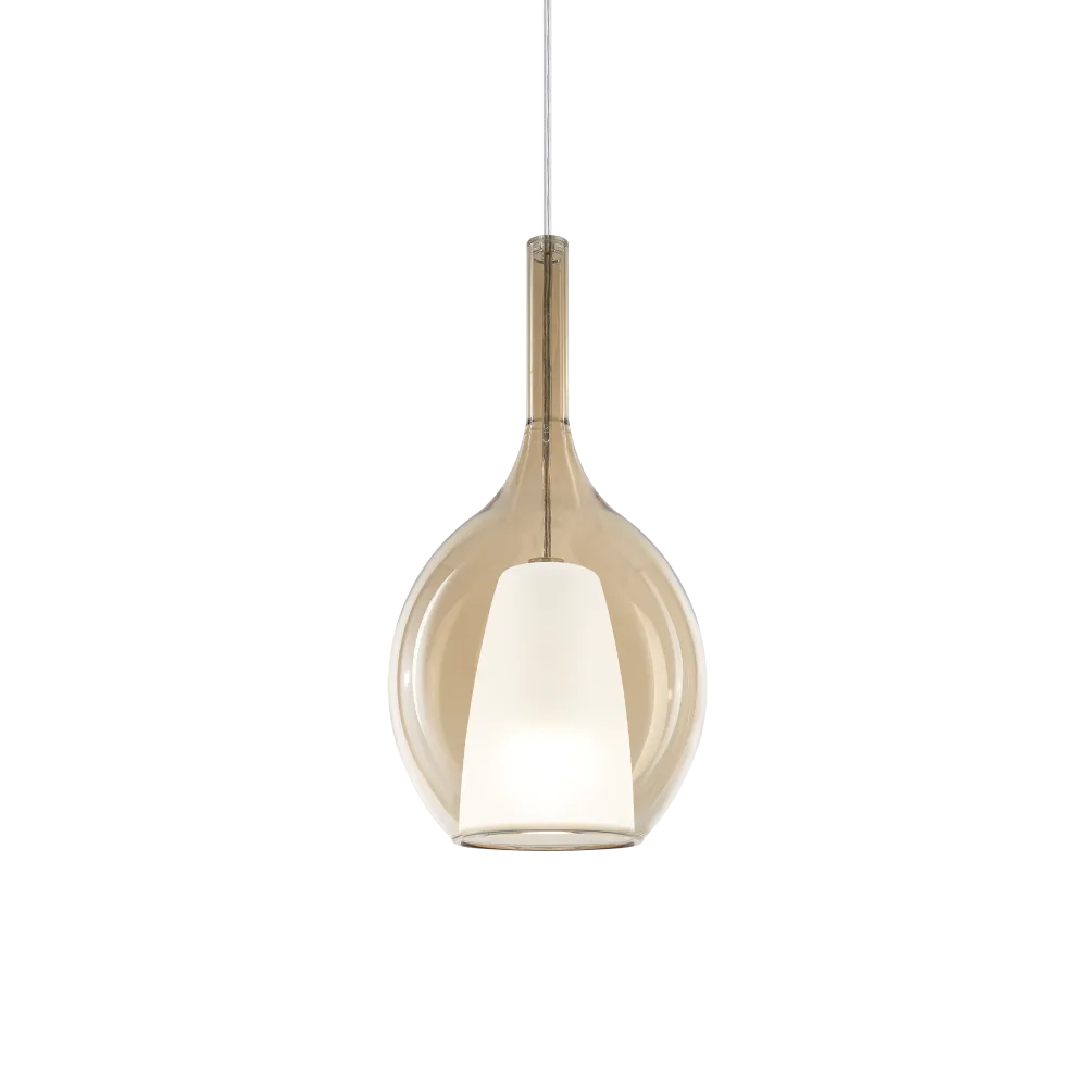 Florón y armazón en metal barnizado mate. Difusor de doble crista borosilicatado uno interno satinado uno exterior con pantalla en diferentes acabados de cristal ambar, azul, ahumado transparente o cobre. Cable de pvc negro. Color: negro.